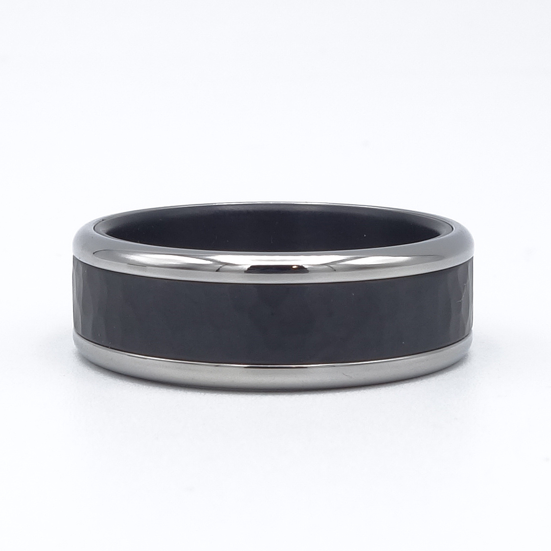 De ring is voorzien van twee banen edelstaal. Het middendeel is zwarte hamerslag. De ring op de foto is bijna 8 mm breed. Deze breedte kan naar wens worden aangepast.