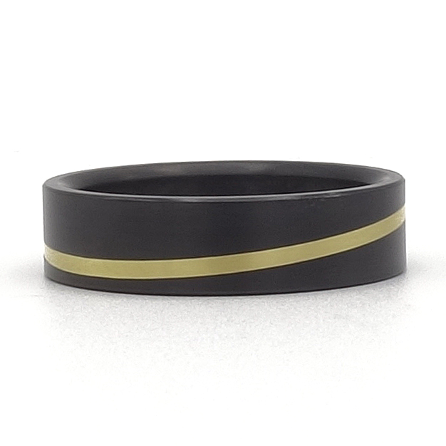 Deze zirkonium ringen zijn 6 mm breed en ingelegd met 18 krt geelgoud.