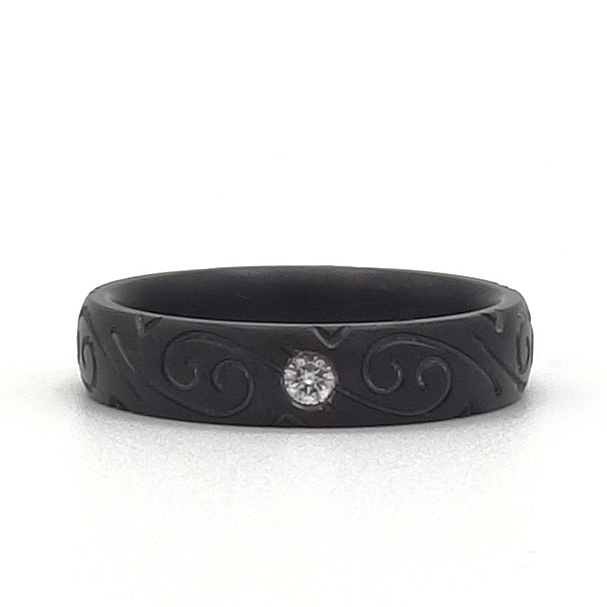 Een lieve combinatie in zwarte kleur: de smalle ring van 4 mm heeft een schattig patroon en een kleine diamant van 0.025 ct. De gladde ring is eenvoudig en gemakkelijk te dragen.